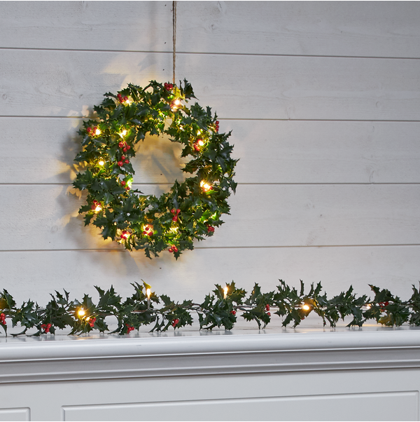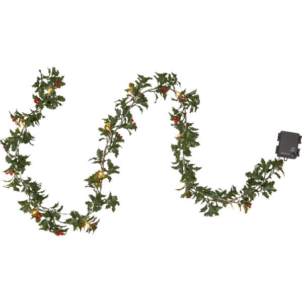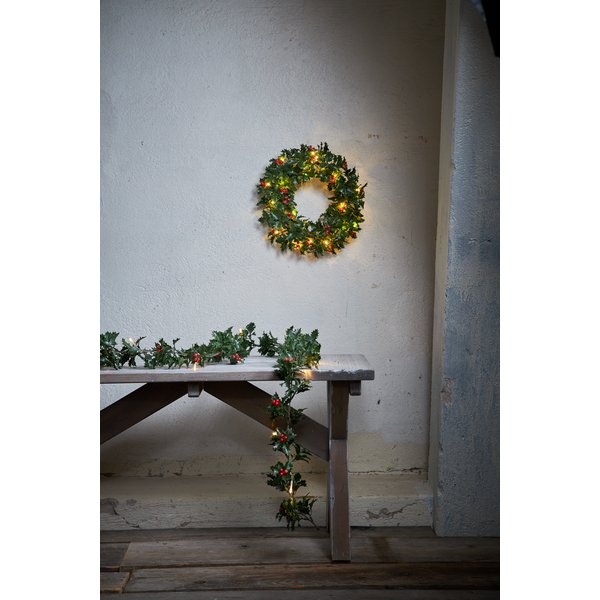 Holly girlang är 180 cm lång och har löv i form av järnek och små röda bär. Dessa är gjorda i PE material, vilket är ett bra miljöval. Med 12 varmvita ljuspunkter går den att använda både som en girlang på ett räcke utomhus eller som en bordsdekoration inomhus. I familjen Holly har vi även en krans. Den drivs av 3 AA batterier och har även timerfunktion och när brytaren är på timerläget lyser kransen i ca 30 dagar. Batterier ingår ej.