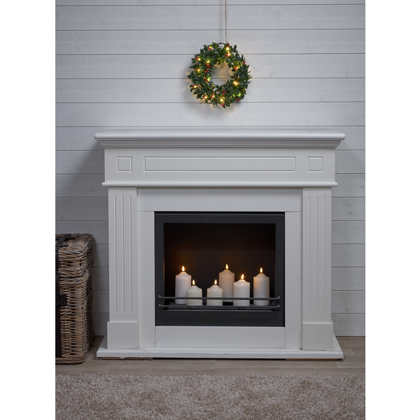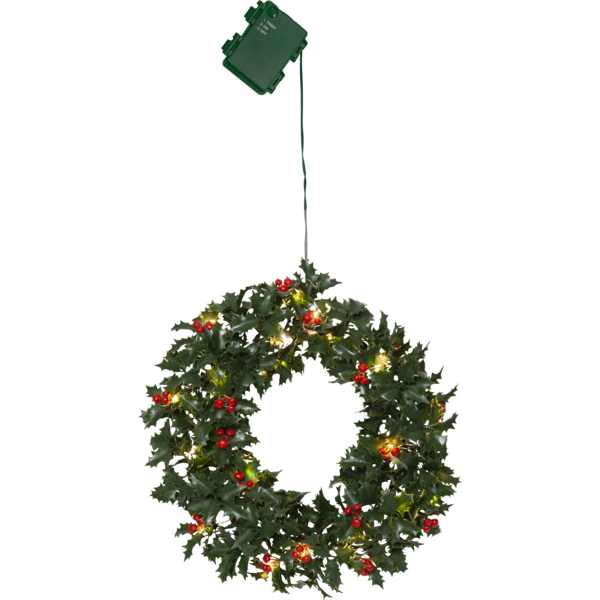 Holly krans med diametern 30 cm har löv i form av järnek och små röda bär. Dessa är gjorda i PE material, vilket är ett bra miljöval. Med 20 varmvita ljuspunkter går den att använda både som en dörrkrans utomhus eller som en väggkrans inomhus. I familjen Holly har vi även en girlang. Den drivs av 3 AA batterier och har även timerfunktion och när brytaren är på timerläget lyser kransen i ca 30 dagar. Batterier ingår ej.