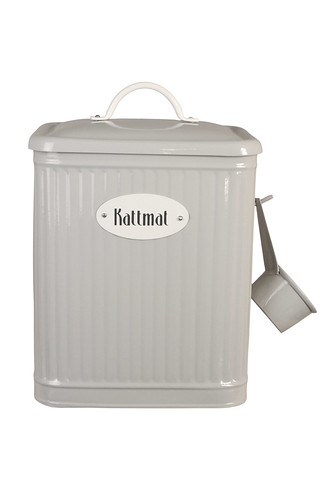 Plåtburk i beige med skylt i vitt och texten "Kattmat". En skopa som kan hängas på sidan medföljer.