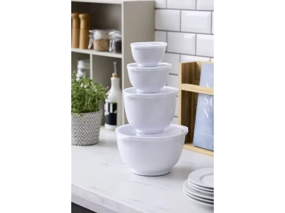 Set med Margrethe blandningsskålar i 4 av de vanligaste storlekarna. Setet innehåller 0,25 + 0,5 + 1,5 + 3 liter Margrethe-skålar med tillhörande lock.